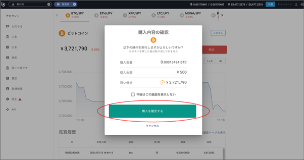 3. 購入内容に間違いがなければ「購入を確定する」を押下します。入力し直す場合は「キャンセル」をクリックしてください。※5秒ごとに買い価格は更新されます。